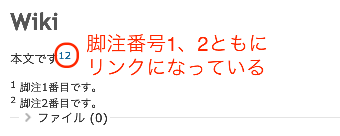 テキスト書式のTexitle記法には脚注(Footnotes)という記法があります。 本文中に脚注番号を挿入し、対応する脚注の文をページの最後に記載すると、脚注番号が脚注の文へのリンクになり、ジャンプできるようになります。