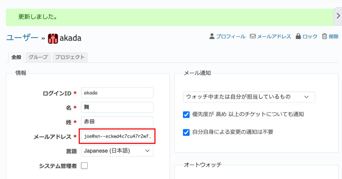 ユーザーアカウントの作成や更新時に、"joe@ドメイン名例.jp"やそのASCII表現である"joe@xn--eckwd4c7cu47r2wf.jp"のようなIDNメールアドレスが使用できるようになりました。