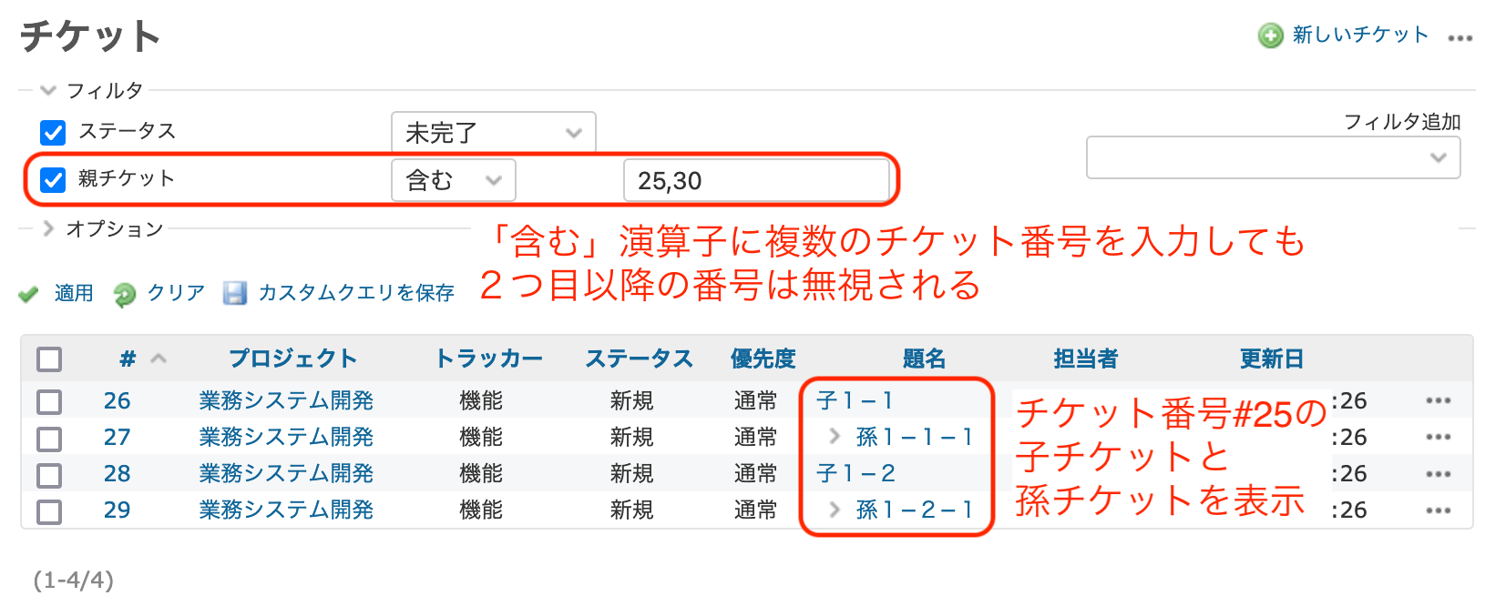 RedMica 2.4 以前のバージョンの「親チケット」フィルタの「含む」演算子では、親チケットの番号を2つ、例えば25と30を入力して適用をクリックすると、エラーにはなりませんが、先頭の25のみ受け付け、25の子孫チケットのみ表示されます。