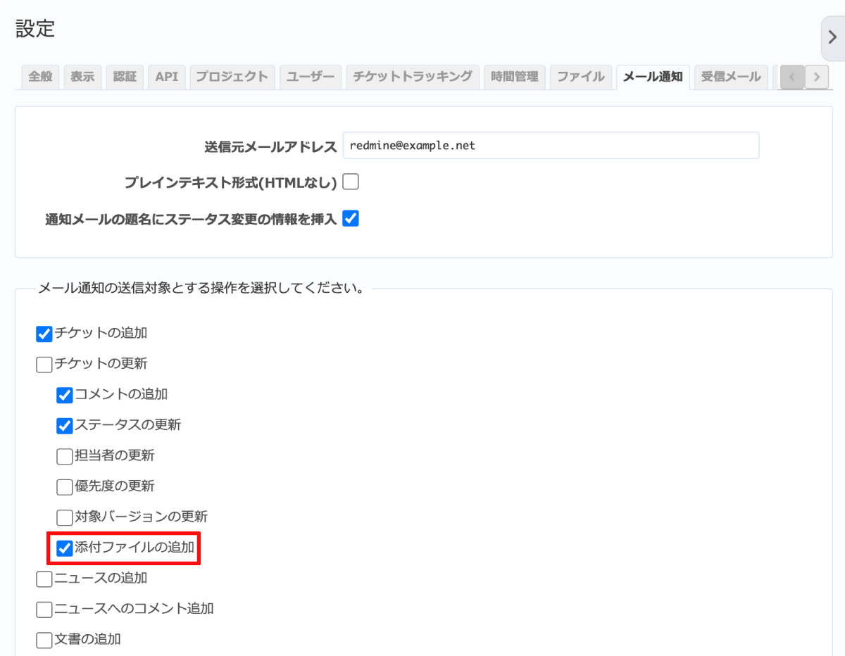 現在も「管理」→「設定」→「メール通知」タブ→「メール通知の送信対象とする操作を選択してください。」の設定で「チケットの更新」をONにすれば、チケットにファイルが添付されるとメール通知が送信されます。しかしながら、メール通知を減らすために「チケットの更新」をOFFの状態で「コメントの追加」や「ステータスの更新」などをONにしていると、ファイルが添付されただけではメール通知は送信されません。そのためコメントなしでファイルが添付されると気がつかないことがあります。