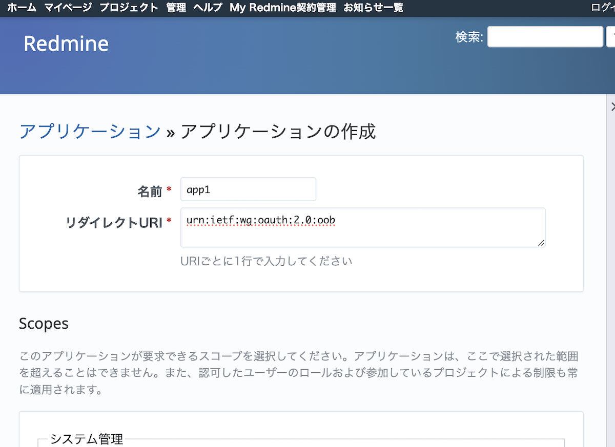 OAuth2を利用するには、まずRedmine側で「アプリケーション」を登録する必要があります。