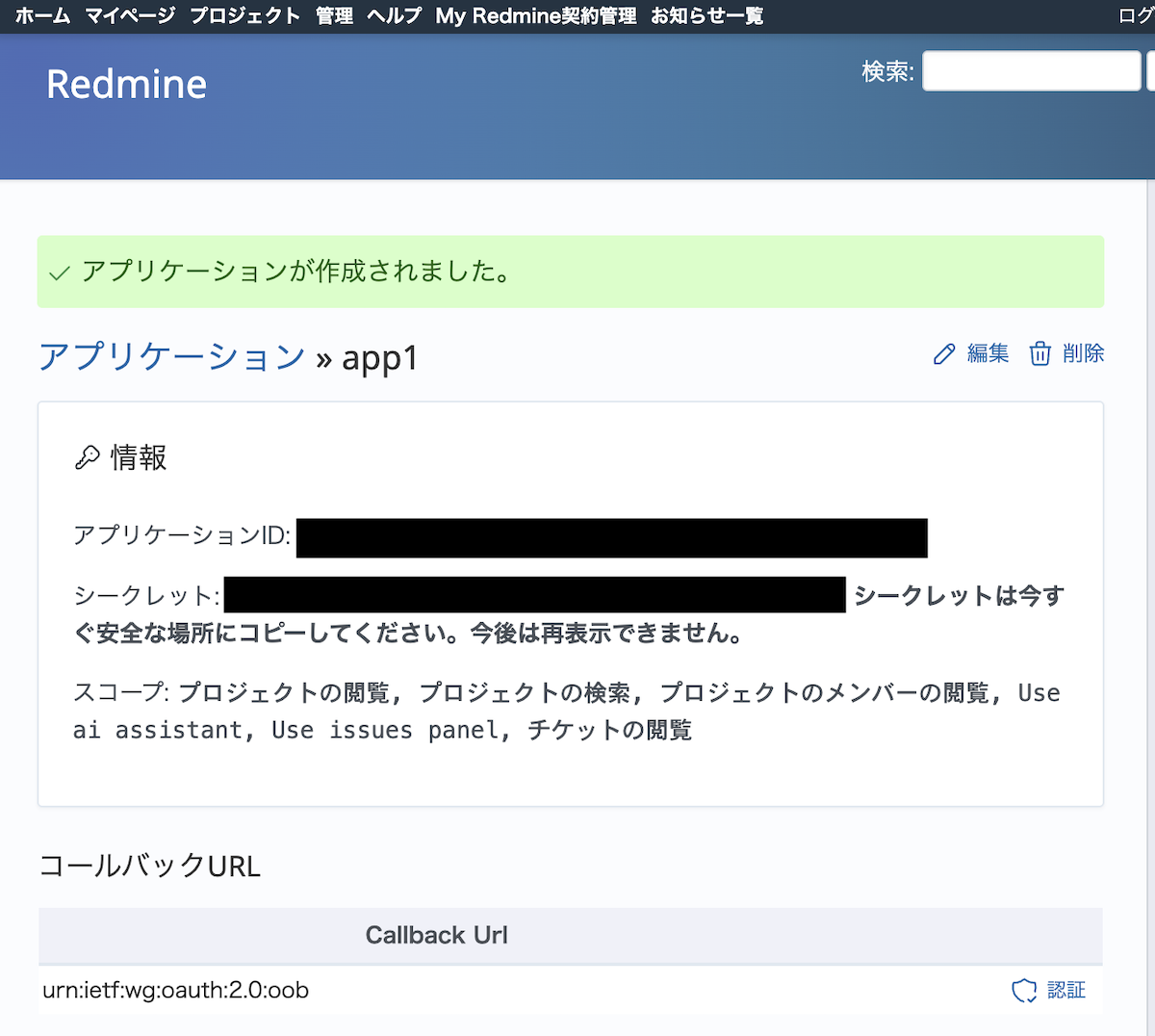 view_issues)にチェックを入れます。Redmine上の各権限がスコープとして定義されています。スクリプト等のアプリを作成する際は、実装する機能に合わせて必要なスコープを選択してください。なお、スクリプト等のアプリを作成する際に、実際に利用するスコープを宣言する必要があります。