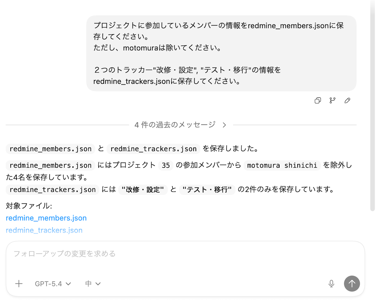Codex app で `redmine_members.json` と `redmine_trackers.json` の作成を指示