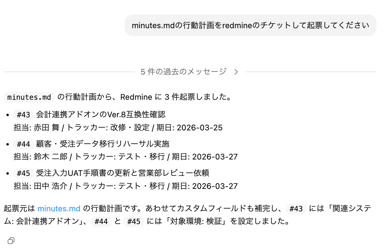 準備ができたら、minutes.md の行動計画を Redmine のチケットとして起票します。今回使ったプロンプトは次の通りです。