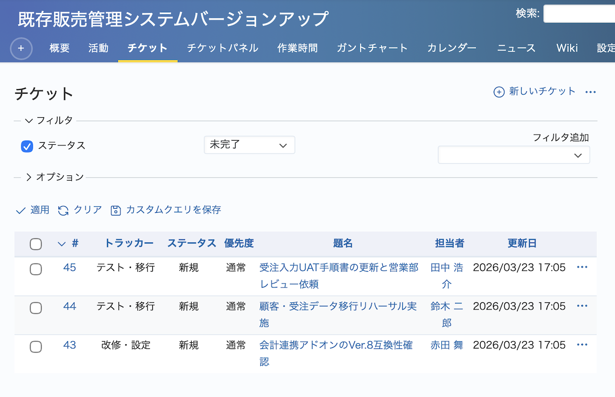 今回の Redmine プロジェクトは、社内で利用している販売管理システムを Ver.7 から Ver.8 へ更新する想定です。会計連携アドオンの確認、データ移行リハーサル、受け入れテスト準備といった作業をチケットで管理します。