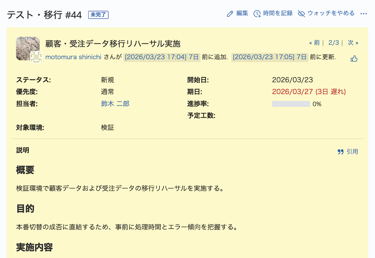 | テスト・移行 | 受注入力UAT手順書の更新と営業部レビュー依頼 | 田中 | 2026-03-27 | 対象環境: 検証 |
